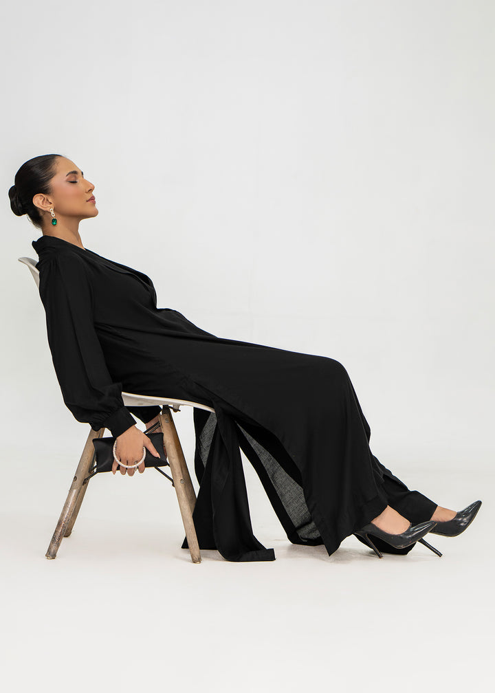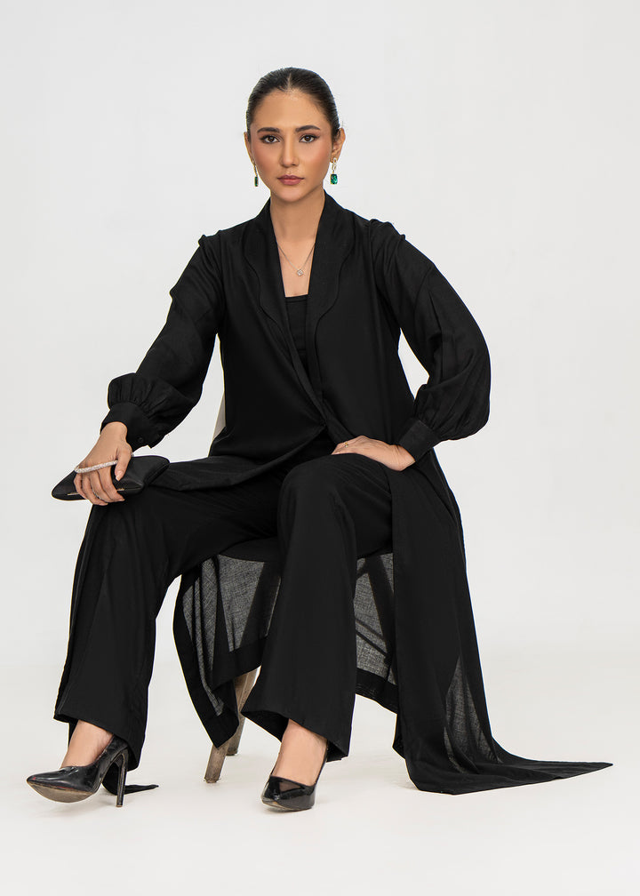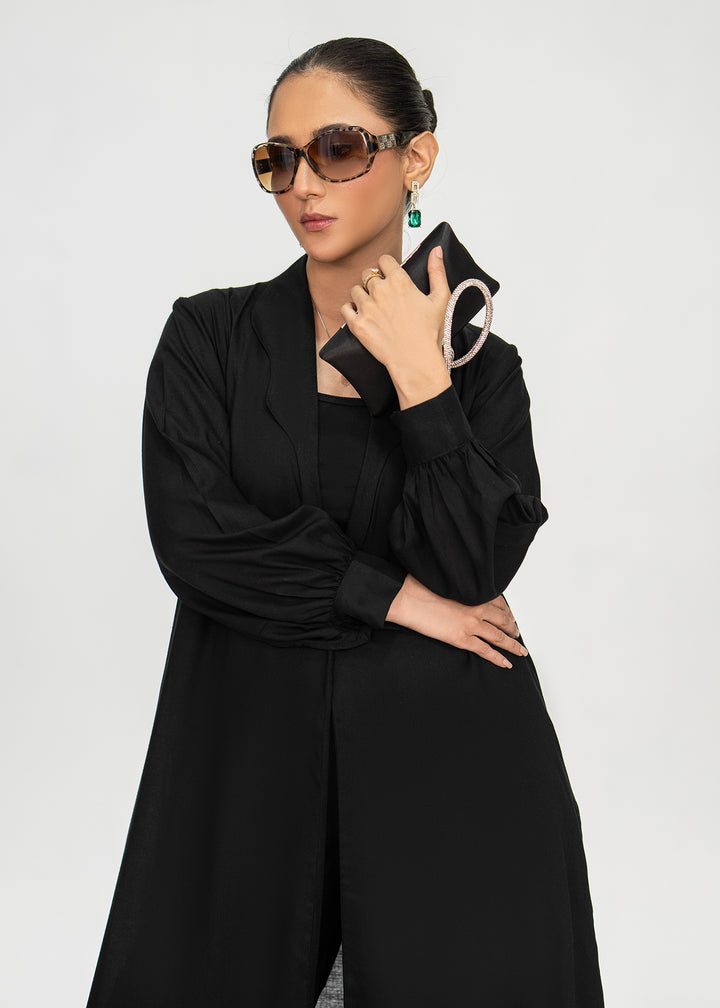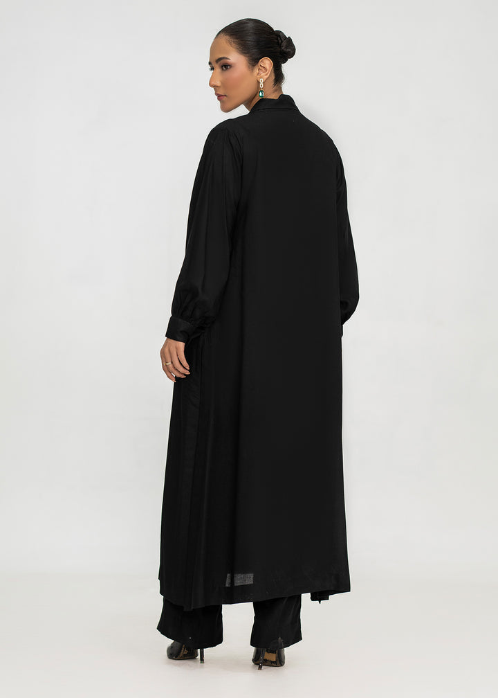 Sleek and elegant, this black gown brings a modern touch to classic style. Crafted from soft Arabic lawn with a tailored collar and slightly loose fit, its front-open design pairs beautifully with slub linen trousers for a stylish and versatile look.