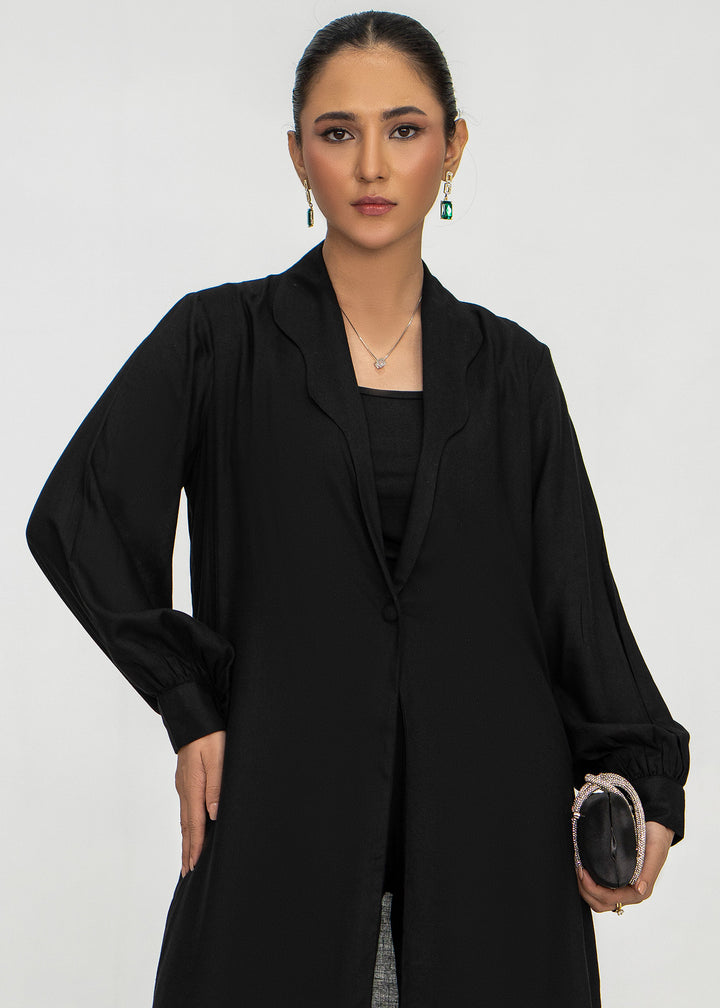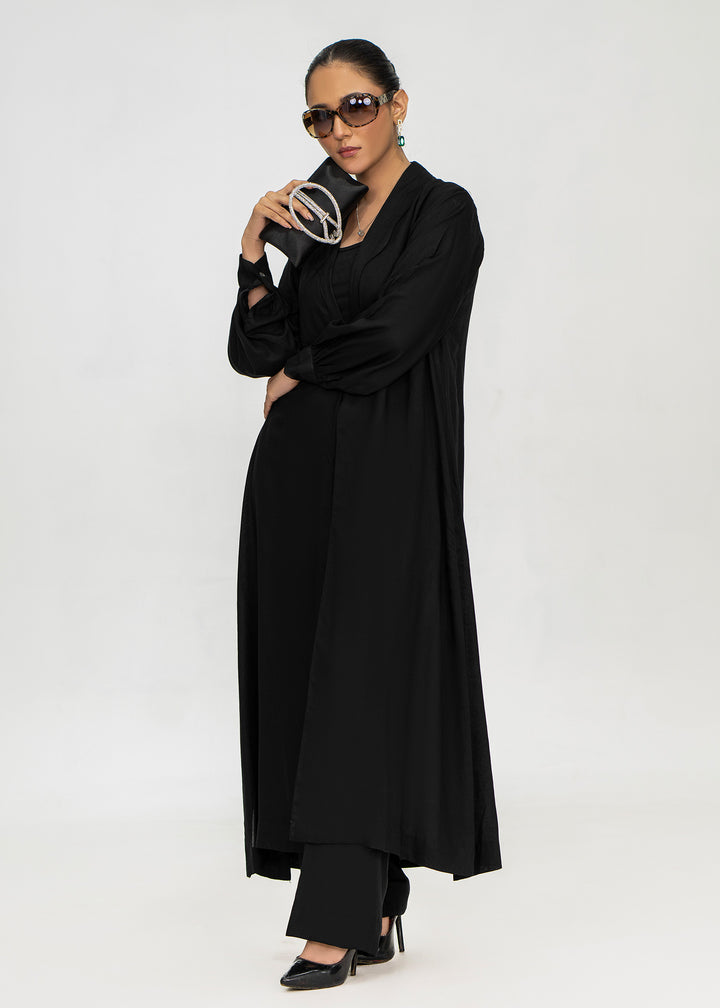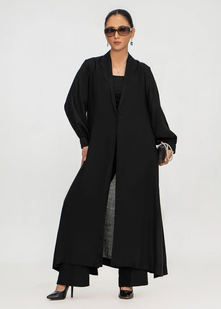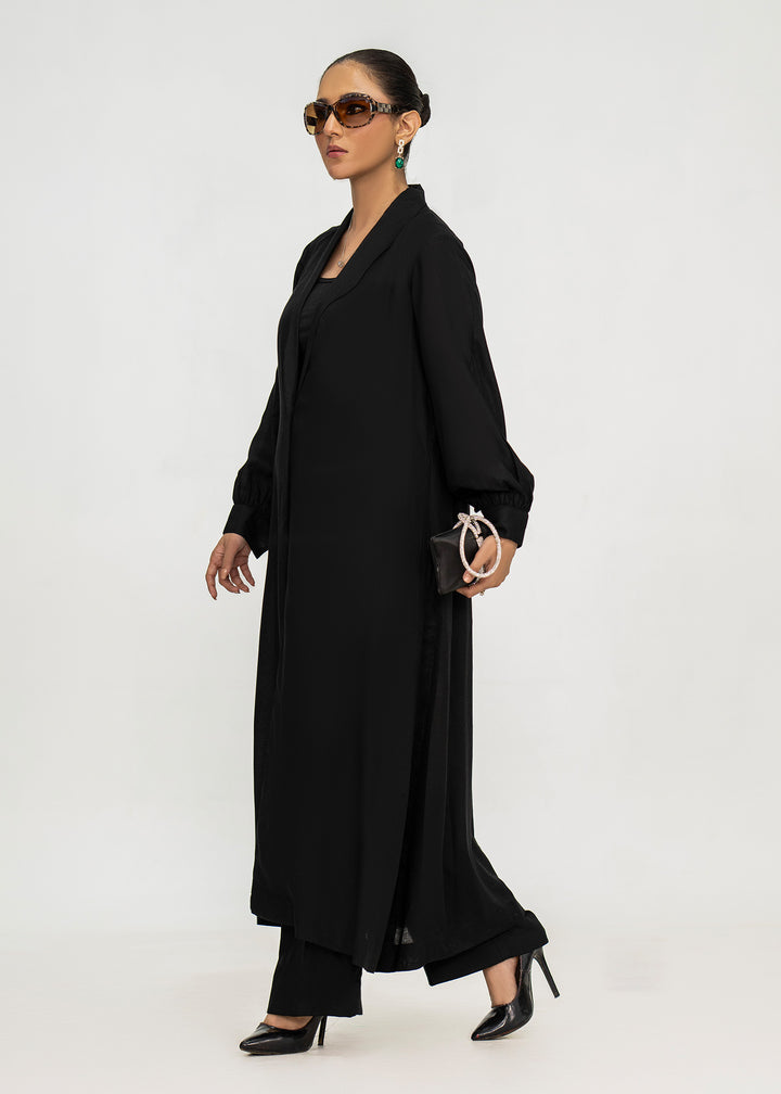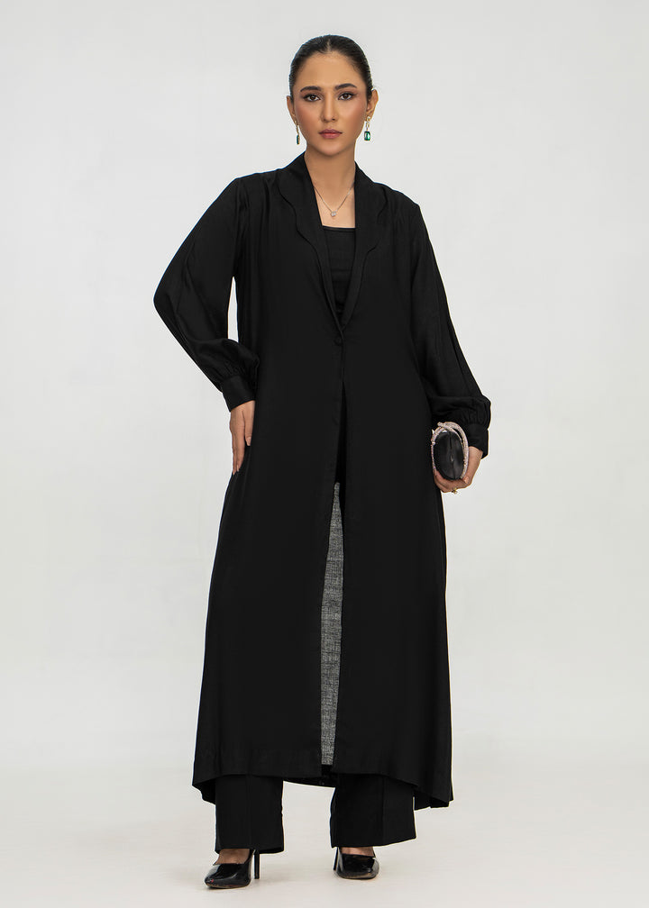 Sleek and elegant, this black gown brings a modern touch to classic style. Crafted from soft Arabic lawn with a tailored collar and slightly loose fit, its front-open design pairs beautifully with slub linen trousers for a stylish and versatile look.
